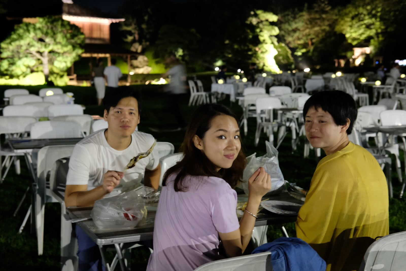 最後我們只遜遜的搶到了僅剩的烤魚跟炸物,擦乾雨下過的座椅就狼狽的開吃了。烤物跟炸物都涼掉了味道很普通,但環繞著日式庭院的氣氛還是不錯,要是再來杯啤酒就更好~!